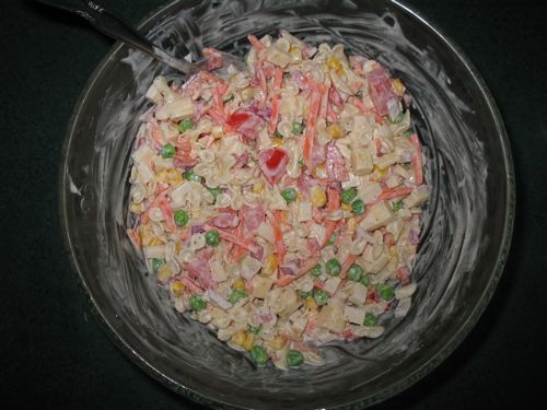 Cook your carb and drain. Mix in chopped meat, veggies, soup, creamed corn, cheese and spices. Pour into greased 2 quart casserole dish. Sprinkle on crunchy topping. Bake at 375˚ for about 30 min until bubbly and hot. Serve with salad and bread, if desired. :)